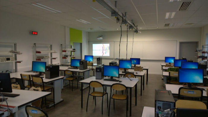 • 12 postes de travail composés de PC et de l’instrumentation associée : oscilloscopes, GBF, additionneurs, accessoires audio, etc